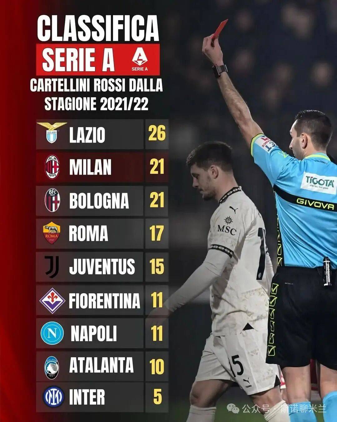 今天米兰新闻网在社媒上发了一个意甲联赛进五个赛季来的红牌榜,虽然此前感觉上米兰得到的红牌是有点多的,但是一看统计还是有些意外。